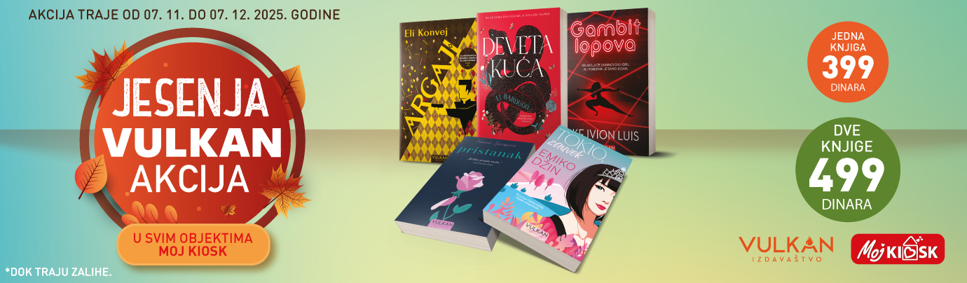 Od 7. novembra do 7. decembra 2025. traje Vulkanova jesenja akcija – prilika da omiljene naslove nabavite po izuzetnim cenama: jedna knjiga – 399 RSD, dve knjige – 499 RSD, koje možete potražiti u svim objektima Moj kiosk.