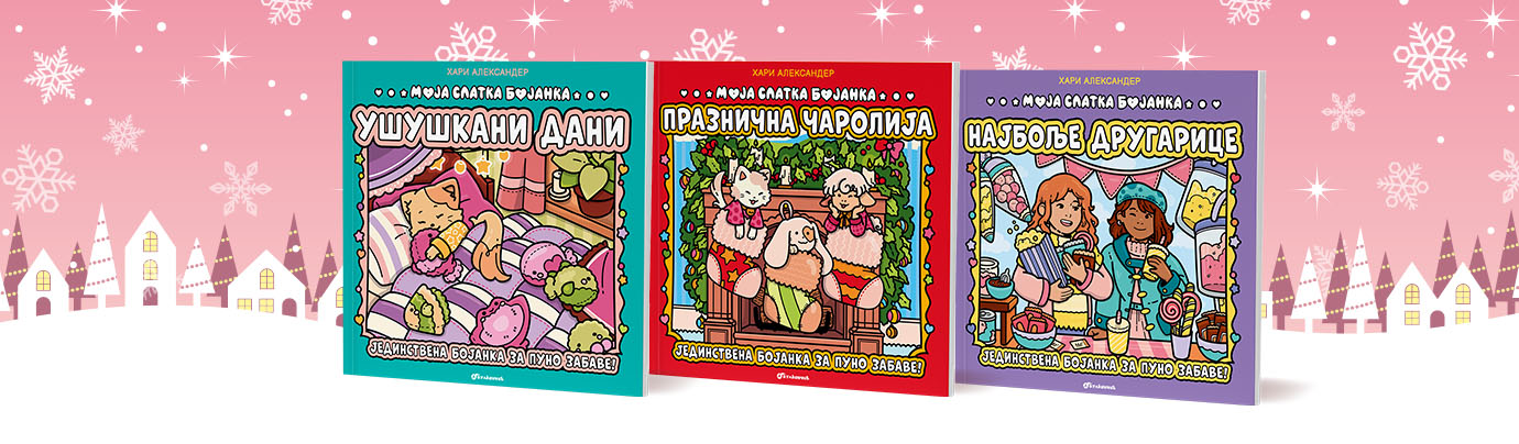 Serijal Moja slatka bojanka dolazi u tri izdanja: Ušuškani dani, Praznična čarolija i Najbolje drugarice. Svako od njih donosi toplu, jednostavnu i umirujuću avanturu kroz svet boja. Ilustracije s jasnim linijama i pažljivo prilagođene uzrastu čine ove bojanke idealnim izborom za prve kreativne rituale. Od zimskih prizora i toplih kućnih trenutaka do nezamenjivog druženja s najboljom drugaricom, svaka od ovih jedinstvenih bojanki stvara prostor u kojem dete može da se prepusti mašti, ali i koncentraciji i opuštanju.