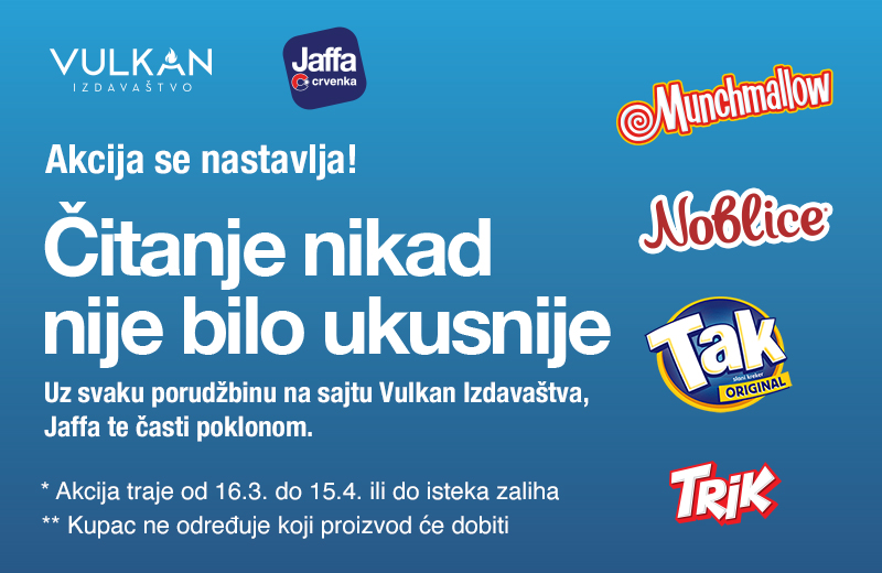 Uz svaku porudžbinu na sajtu Vulkan izdavaštva, bez obzira na izabrani naslov, Jaffa vas časti poklonom. Uz kupljenu knjigu dobijate Jaffa proizvod po izboru: Munchmallow, Noblice, Trik ili Tak, savršeno društvo za čitanje.