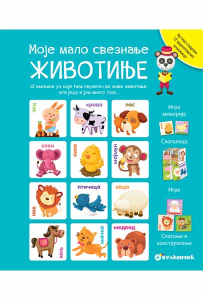 Uči i igraj se!Odlična zabava!Sklopi slagalicu od dvanaest knjižica. Slaži ih prema malim sličicama sa strana.Igra memorije!Među knjižicama postoje po dve slike svake životinje – odrasla životinja i njeno mladunče. Izmešaj knjižice, poređaj na sto licem nadole i pogađaj gde se kriju odgovarajuće životinje i mladunci.Napravi kviz o životinjama!Prelistaj knjižice i osmisli sopstveni kviz u vezi životinja.