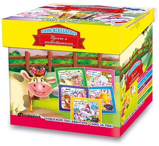 U kovčežiću Mini-iskakalice: Priče o životinjama nalazi se pet interesantnih i ljupkih priča o životinjskim junacima. Svaka od slikovnica donosi određenu pouku: da treba biti poslušan, druželjubiv, vredan, uredan i ljubazan.