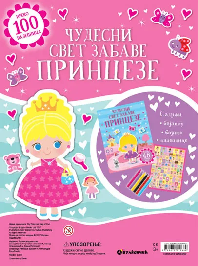 Sadrži bojanku sa 48 slika za bojenje, list sa preko 100 nalepnica, 6 voštanih bojica. Sve je spakovano u šareni paketić.