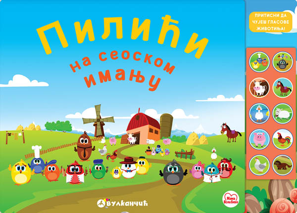 U ovoj veseloj zvučnoj knjizi mališani će se družiti sa luckastim pilićima i ostalim stanovnicima seoskog imanja. Uz pomoć zvučnog modula oživeće životinje na svakoj strani, a moći će i da pevuše uz ljupku pesmicu Mi smo pilići u toku čitanja ili zasebno. Zabava je zagarantovana! Pilići na seoskom imanju je zvučna knjiga sa 10 zvukova kroz koju će deca uz popularnu pesmu i zabavnu propratnu priču naučiti koje su to domaće životinje i kako se oglašavaju.