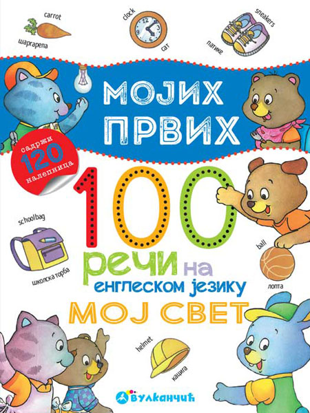 Mojih prvih 100 reči na engleskom – Moj svet je knjiga uz koju će deca naučiti mnogo novih reči na engleskom i srpskom. Ova knjiga je pravi način da se objedini učenje i igra. Deca će čitajući ovu knjigu i lepeći nalepnice, učiti reči na srpskom i engleskom jeziku. Knjiga prati slatke medvediće u njihovom domu: kuhinji, kupatilu, dnevnoj sobi, ali i u igri, kupovini, na poslu. Oko glavne scene poređani su pojmovi koji na svim tim mestima okružuju medvediće.
