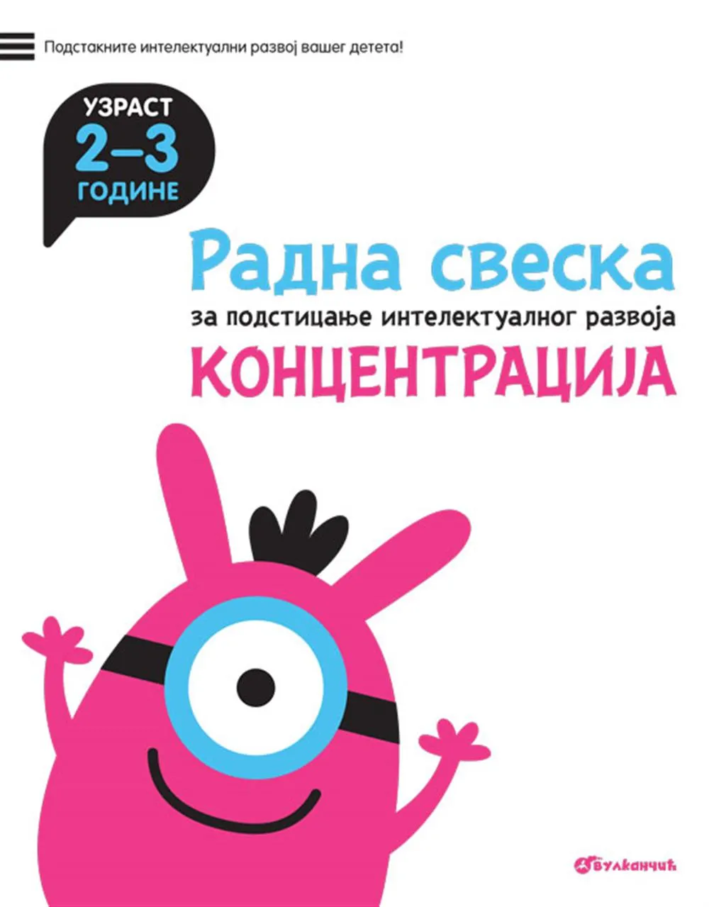 Radna sveska za podsticanje intelektualnog razvoja: Koncentracija, za uzrast 2–3 godine, obuhvata pitanja sa kojima se dete sreće u svakodnevnom životu, posebno dok se igra, a koja se odnose na povezivanje crtica i kružića, povlačenje linija, bojenje, lepljenje nalepnica, sečenje i savijanje papira, a sve sa ciljem podsticanja intelektualnog razvoja deteta.