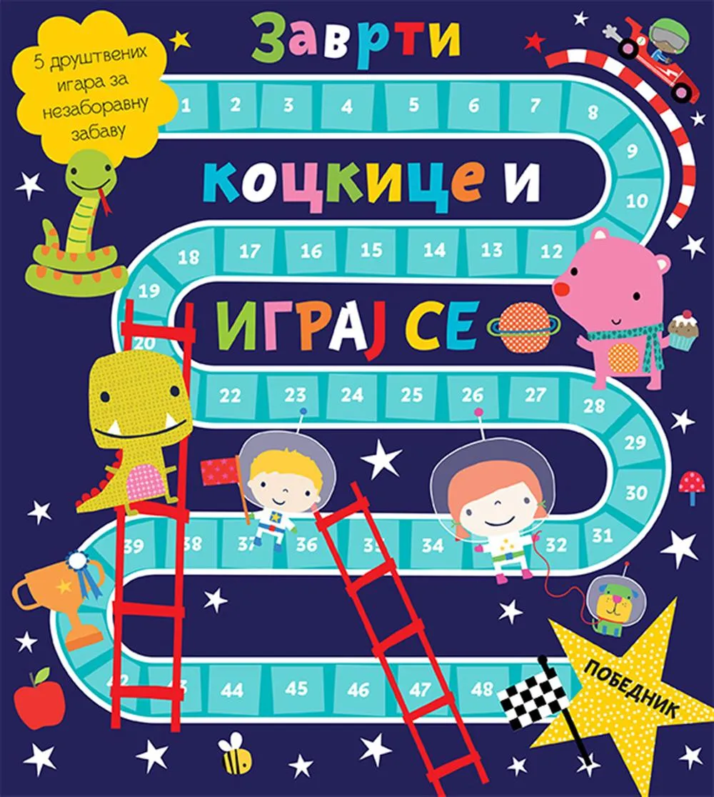 Zabavi se uz pet uzbudljivih društvenih igara, savršenih za igru u kući, napolju ili gde god poželiš! Ako želiš da jurcaš po trkačkoj stazi, letiš u svemiru, ideš na piknik sa medvedićima i igraš se klasičnih igara kao što su ne ljuti se, čoveče i zmije i merdevine, ovo je prava knjiga za tebe!
