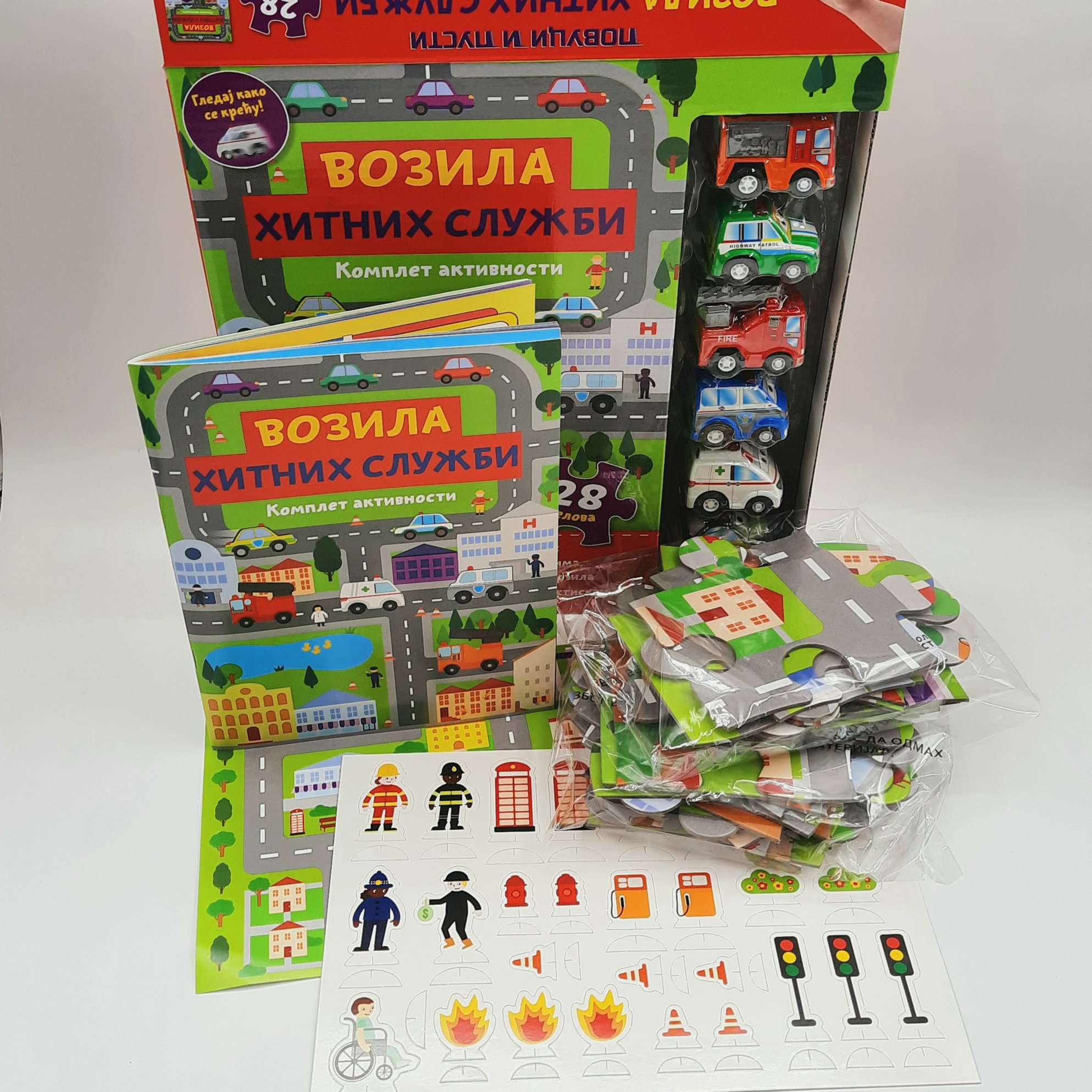Najpre sastavi delove slagalice i tako napravi veliku podlogu za igranje (42 x 61 cm). Zatim uzmi 6 vozila, postavi ih na podlogu, povuci ih i gledaj kako se kreću! Osim toga, svoj teren za igru možeš obogatiti sa preko 25 delića na istiskanje, među kojima su i saobraćajne kupe i semafori koje možeš postaviti gde god poželiš.