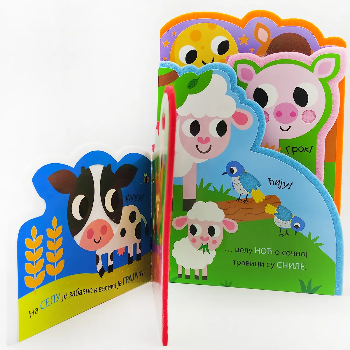 U ovoj knjižici upoznaćete životinje koje žive na selu. Čitajte i zabavite se opipavajući teksture od filca na svakoj strani.