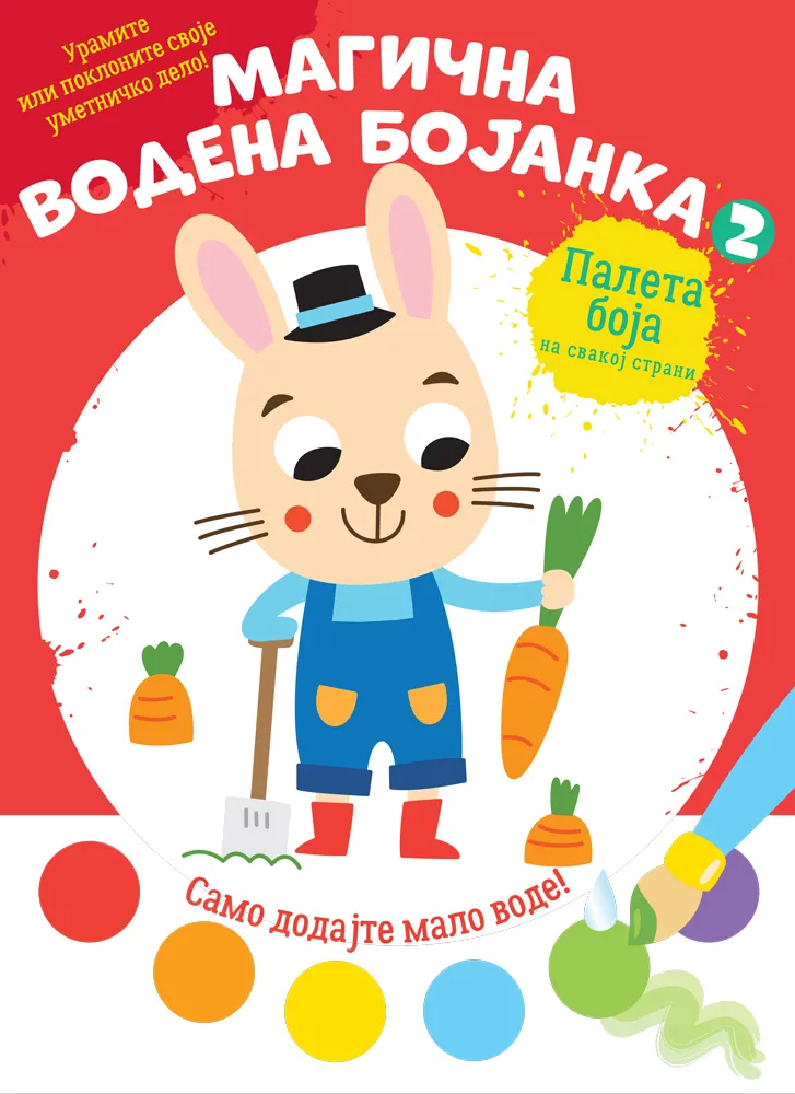Paleta boja nalazi se na svakoj strani, a uz bojanku dolazi i četkica. Biće vam potrebno samo malo vode i zabava može da počne!