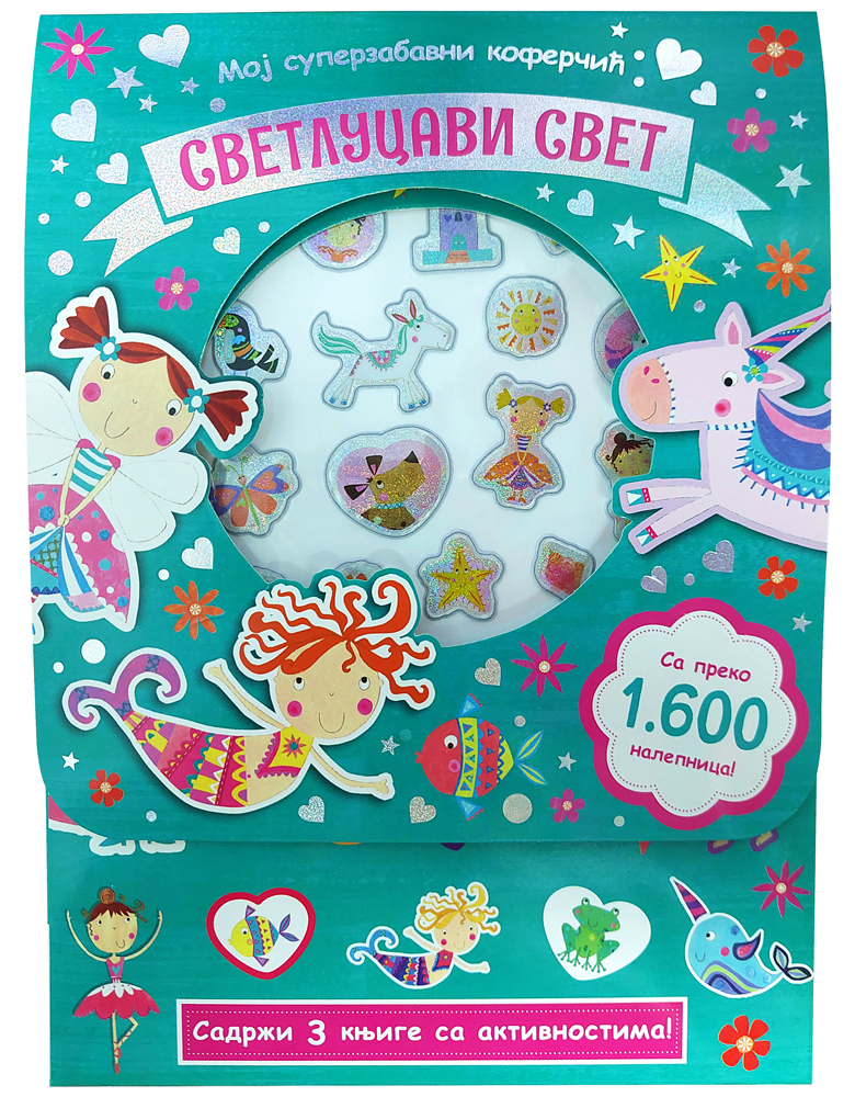 Ovaj superzabavni koferčić sadrži 3 knjige sa aktivnostima i preko 1.600 nalepnica! Ponesite ga sa sobom gde god da krenete i uživajte u crtanju, lepljenju nalepnica i rešavanju zabavnih mozgalica. Svi mali ljubitelji princeza, sirena i životinja obožavaće aktivnosti unutar ovog koferčića! Moći će da iskoriste nalepnice i šablone da stvore svoja mala umetnička dela.