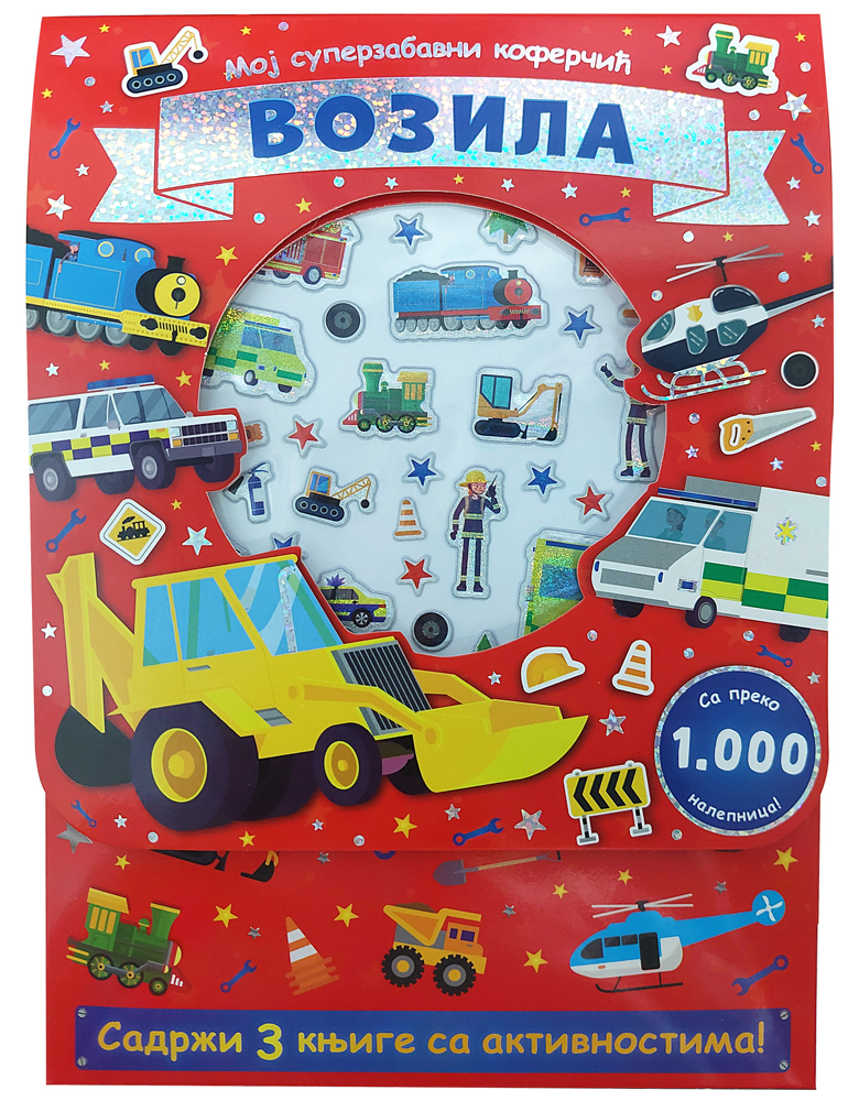Ovaj superzabavni koferčić sadrži 3 knjige sa aktivnostima i preko 1.000 nalepnica! Ponesite ga sa sobom gde god da krenete i uživajte u crtanju, lepljenju nalepnica i rešavanju zabavnih mozgalica. Svi mali ljubitelji vozila i mašina obožavaće aktivnosti unutar ovog koferčića! Moći će da iskoriste nalepnice i šablone da stvore svoja mala umetnička dela.