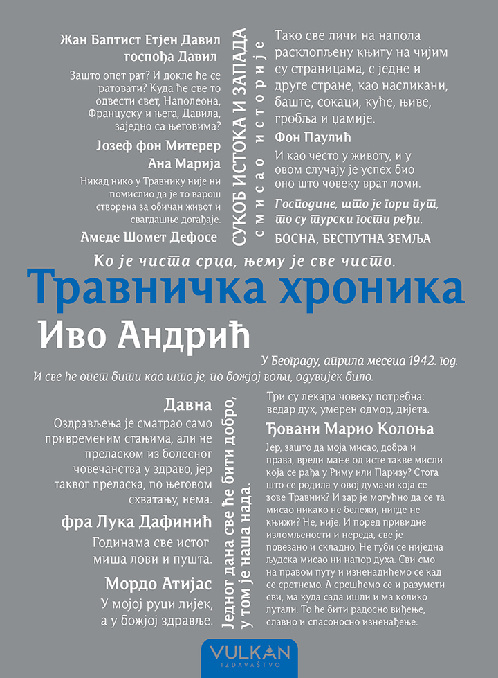 U „Travničkoj hronici" pronalazimo sliku sveta kao pozornice na kojoj se smenjuju sudbine sasvim običnih i malih ljudi. Međutim, na toj istoj pozornici istorija se rašila otkrivajući svoje naličje. Tako je zapodenuto pripovedanje i ispričana je priča u kojoj je Ivo Andrić postavio mnoga pitanja, ali i ono esencijalno – kako dokučiti smisao postojanja u svetu u kojem je ljudska sloboda ograničena i osujećena?