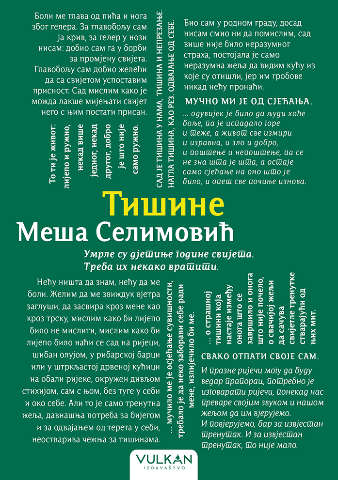 Pred vama se nalazi prvi roman Meše Selimovića. Objavljen je 1961. godine. Šest decenija kasnije u njemu pronalazimo sve dobro poznate osobine književnog stvaralaštva jednog od naših najznačajnijih pisaca XX veka: briljantno umeće pripovedanja, u koje je utkano nastojanje da se čovek sagleda naspram vremena kojem pripada. Za to je potreban dar, ali i snaga duha. Meša Selimović imao je i jedno i drugo, pa je u Tišinama uspeo da oslika unutrašnja previranja i borbe svih onih koji su živeli u delikatnim vremenima.