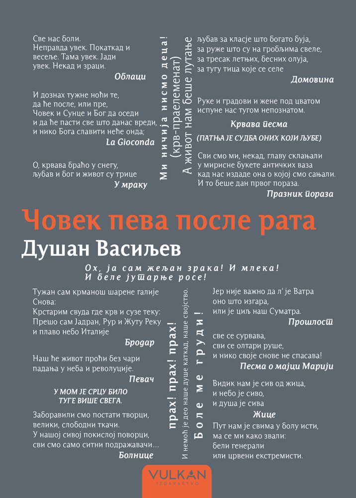 Knjigom Čovek peva posle rata obeležavamo stogodišnjicu smrti Dušana Vasiljeva, i tako posle jednog veka čuvamo od zaborava stihove pesnika koji je do svoje dvadeset četvrte godine, koliko je živeo, ostavio neizbrisiv trag u srpskoj književnosti.