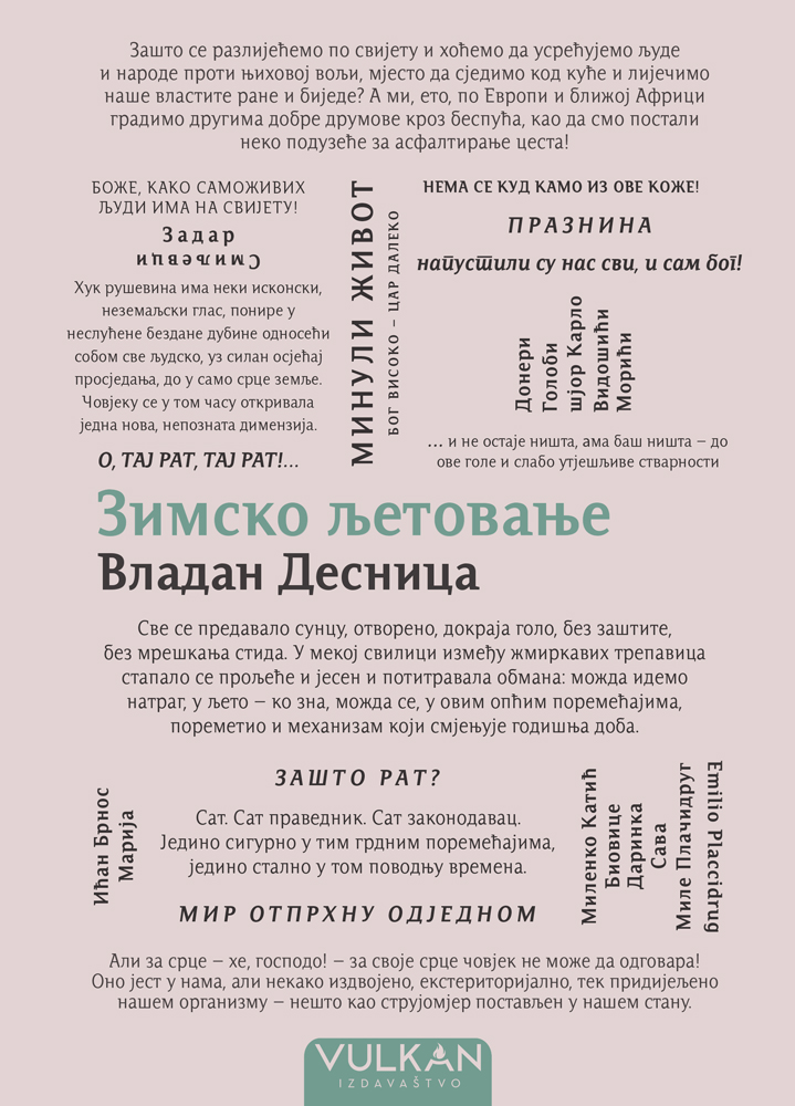 Ni ljeto ni zima – tako nekako smiješno – kazaće šjor Karlo, jedan od junaka ovog romana, želeći da opiše prilike u kojima se i sâm našao sa ostalim likovima književnog sveta Vladana Desnice. Tako je oksimoronom zimsko ljetovanje oslikan pejzaž opštih poremećaja – sve je pomereno i izvitopereno u ratu, osim vremena koje uvek neumitno protiče, podsećajući nas na to da je jedino prolaznost stalna. Zbog toga je gorak i postiđen smeh koji prati misao s početka ovog pasusa.